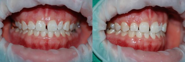 이런 경우 보통 치아가 비뚤비뚤한 경우도 많으셔서 앞니 부분교정을 통해 해결하기도 합니다(아래 사진)